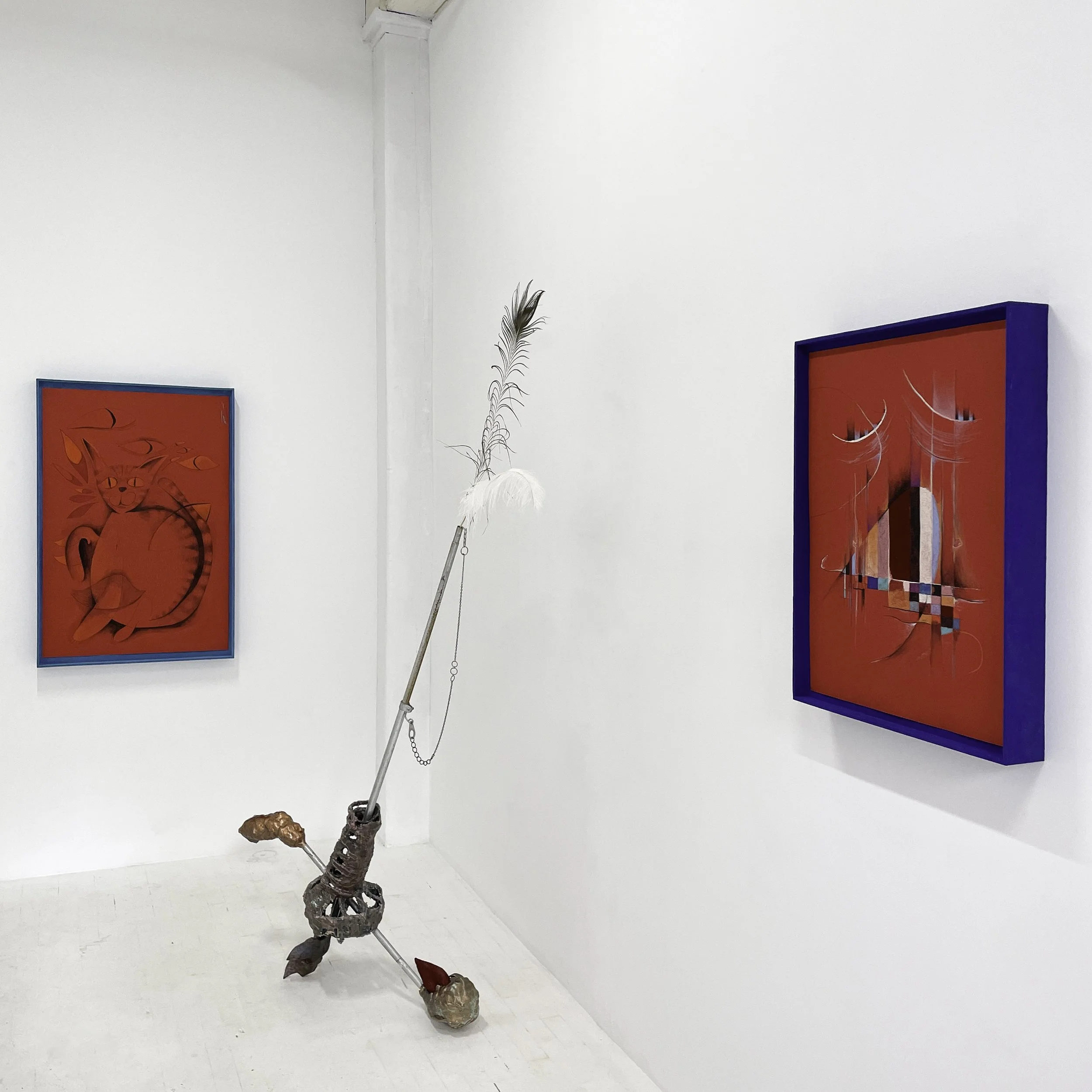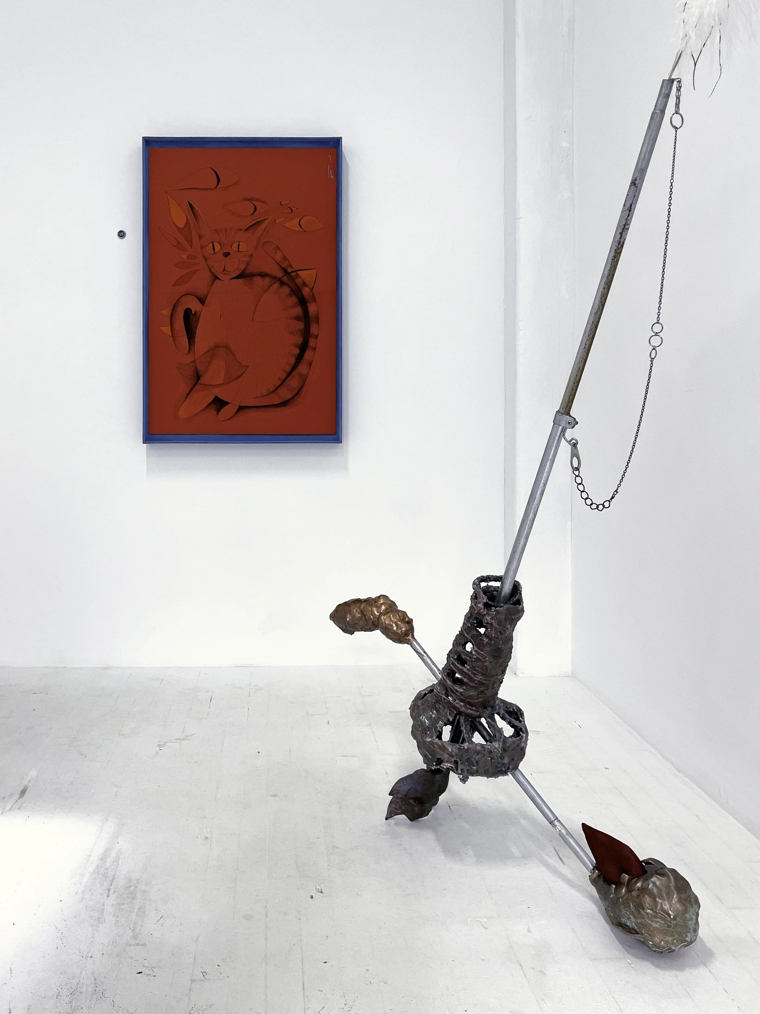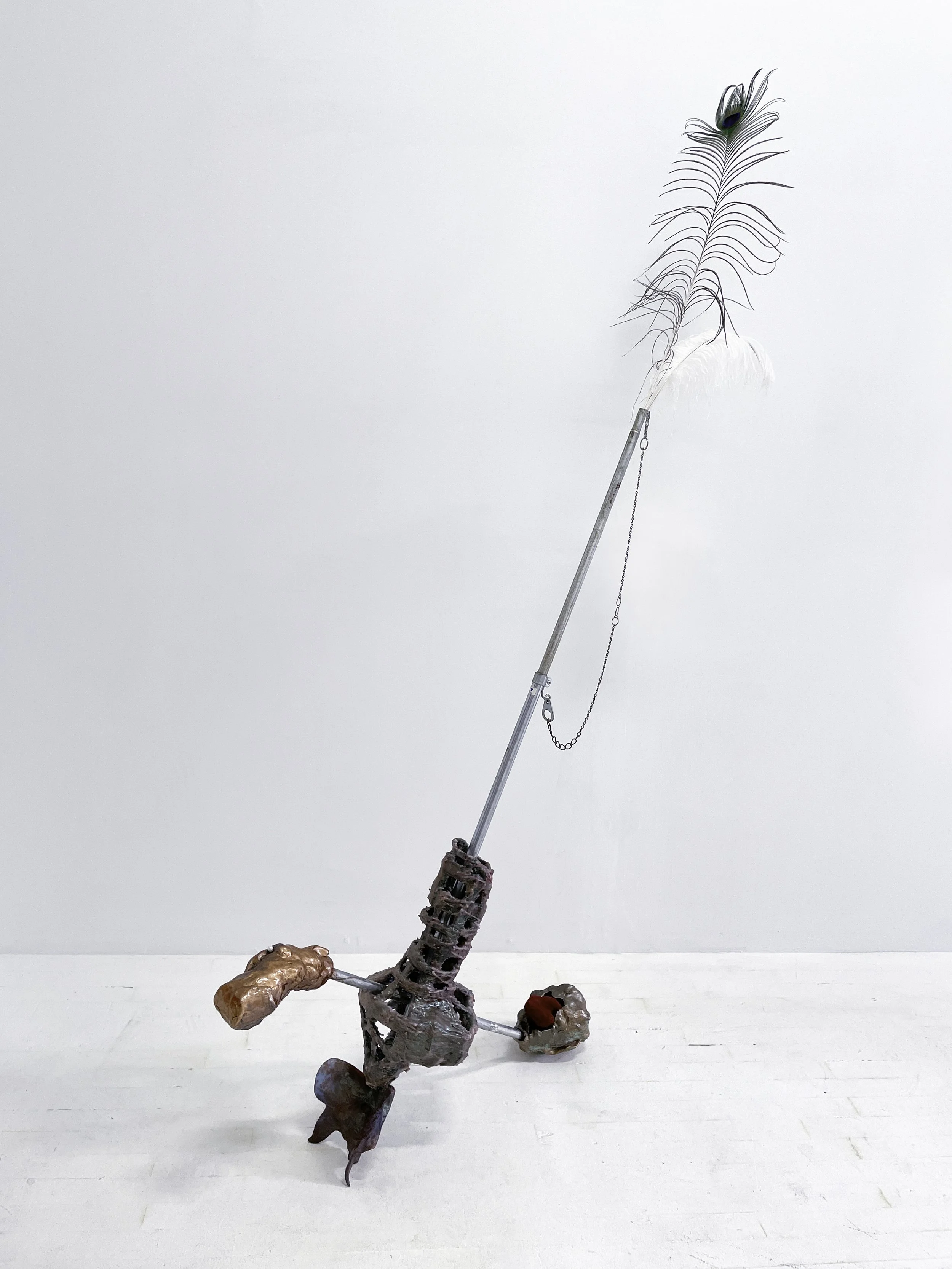 Zach Hill’s uncanny combinations of materials, examine the ways in which LGBTQ folks instinctively communicate and protect one another across geographies often ruled by fear and censorship. His process of assemblage centers misuse and mimesis to reconfigure furniture parts, tripods, cords, and found glass or metal. Hill references city infrastructures, the human figure, and familiar tools or machines. These forms are twisted into freestanding compositions that actively misbehave.