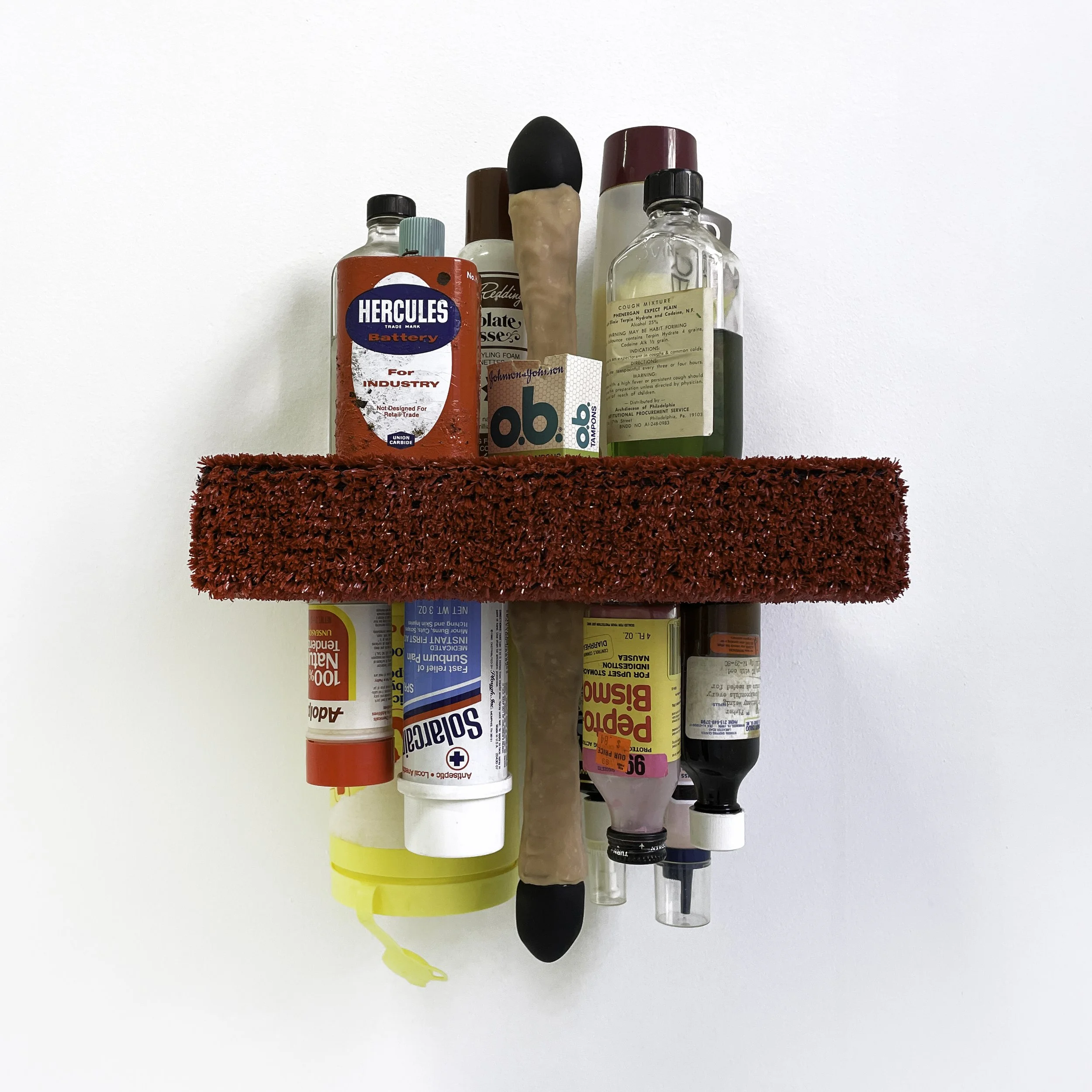 Using found objects from domestic life and images appropriated from celebrity culture, Brice Peterson’s work examines a masochistic relationship with consumerism. In the resulting sculptures, prints, and assembled objects, the private sphere of the home is a site of identification with--and surrendering to--mass-produced consumables, whether toiletries, toys, or TV shows. The home having been violated by the product, the consumer becomes an exhibitionist of brand aesthetics, a submissive vehicle of manufactured nostalgia.